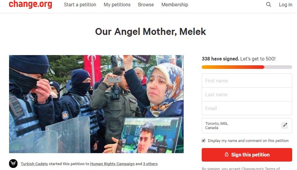 “Melek Cetinkaya, the mother of an innocent Turkish cadet (who received life imprisonment after a coup attempt – orchestrated by his superiors), will begin a peaceful protest on 19th January, 2020.