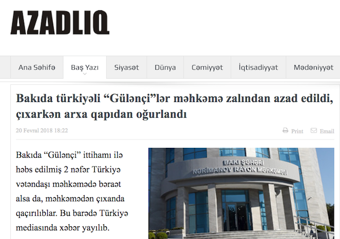 Two Turkish nationals were abducted by a group of unidentified people immediately after they were released from police custody in Azerbaijan, according to media.
